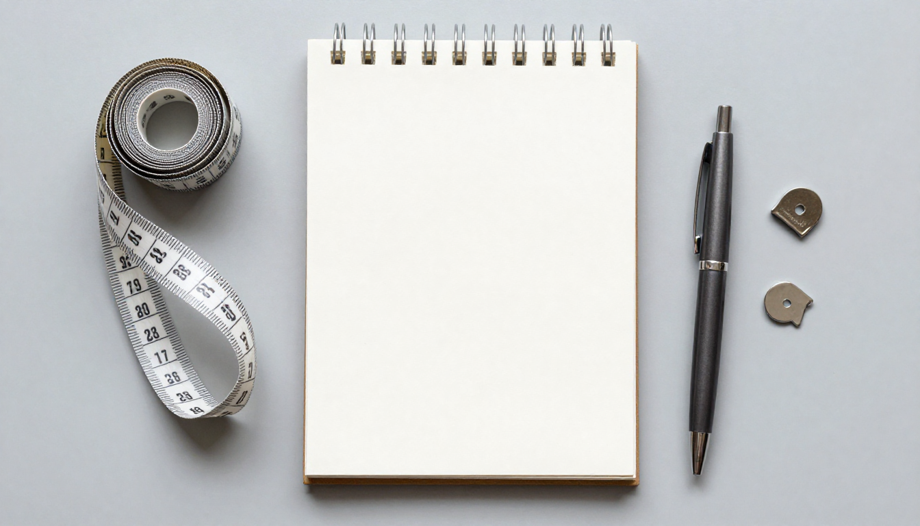 은색 줄자와 종이 노트, 펜, 자석 핀이 깔끔하게 놓인 평면 부감 사진으로 냉장고 크기 측정과 메모를 연상시킵니다.