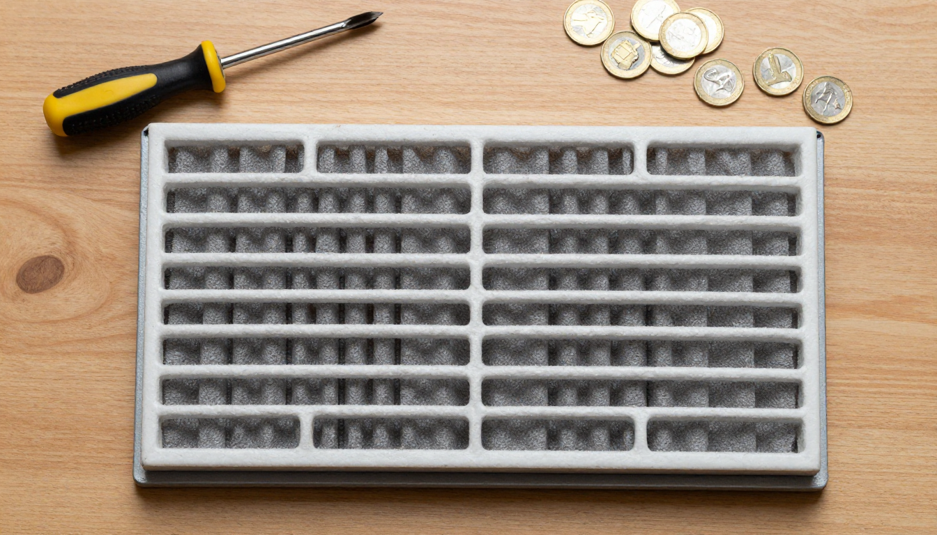 나무 탁자 위에 놓인 에어컨 필터와 드라이버, 동전들을 위에서 내려다본 실사 사진.